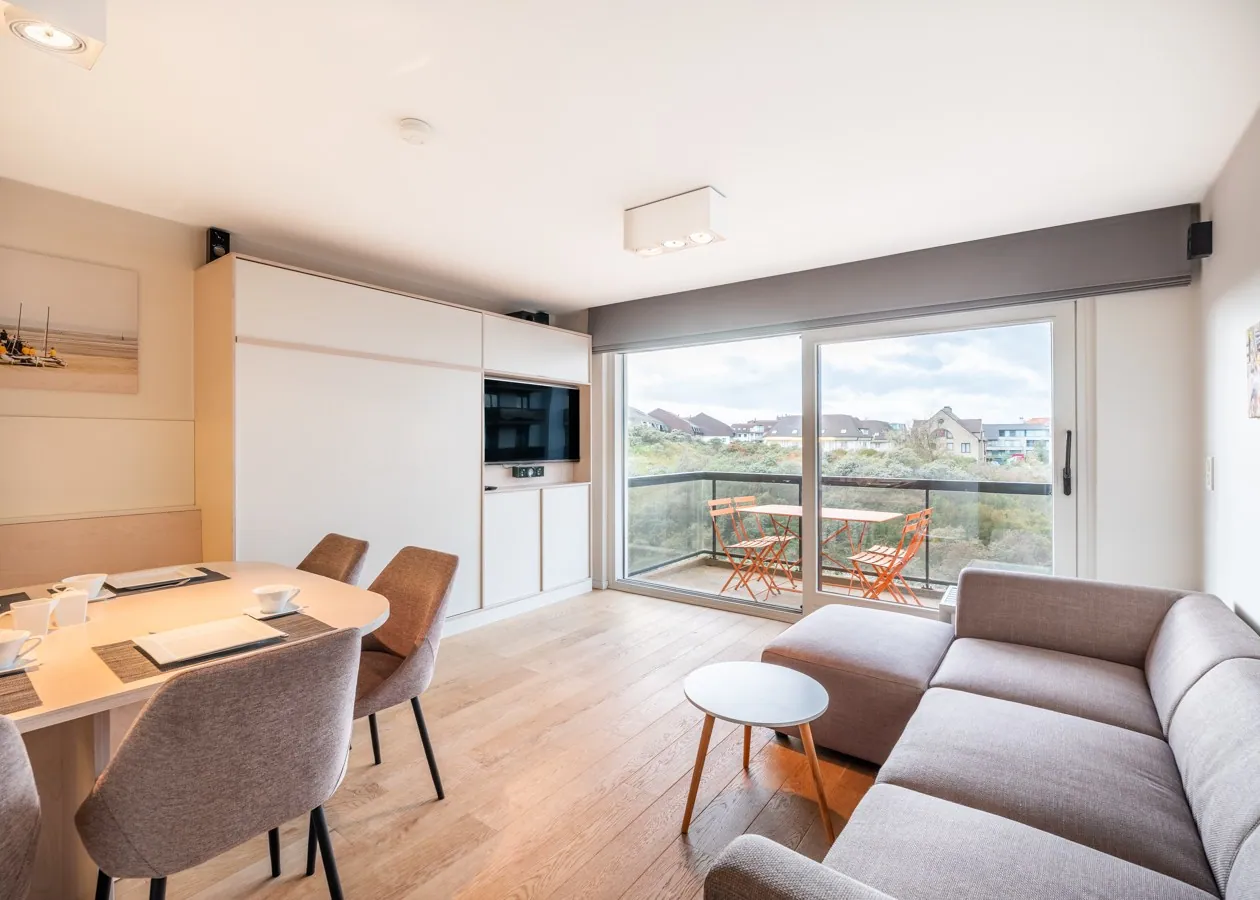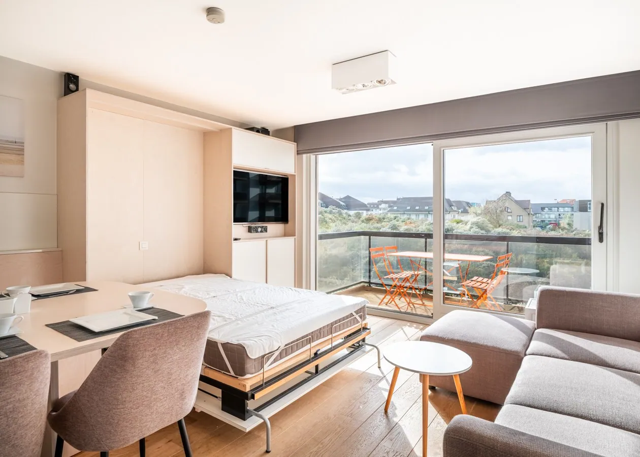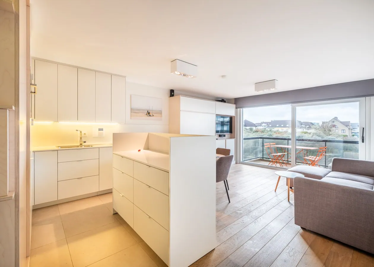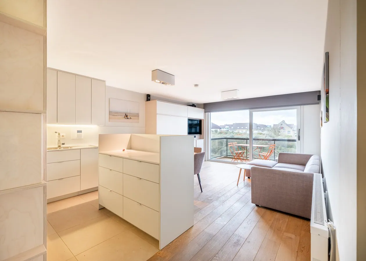 Das Wohnzimmer mit edlem Parkettboden öffnet sich nahtlos zur großen Sonnenterrasse hin. Dieses modern eingerichtete Studio in der zweiten Etage besticht durch seine Lage als Oase der Ruhe, nur wenige Schritte von der Strandpromenade und dem Meer entfernt. Die Schlafplätze für vier Personen verteilen sich auf ein Doppel-Schrankbett und eine Schlafnische mit Etagenbett. Eine voll ausgestattete Küche mit Geschirrspüler und ein Badezimmer mit Dusche vervollständigen die hochwertige Ausstattung.