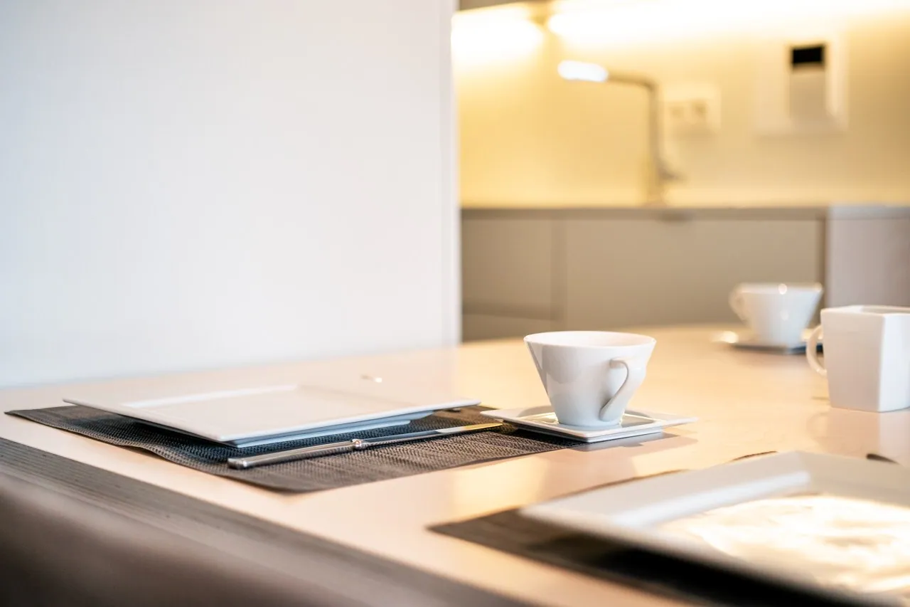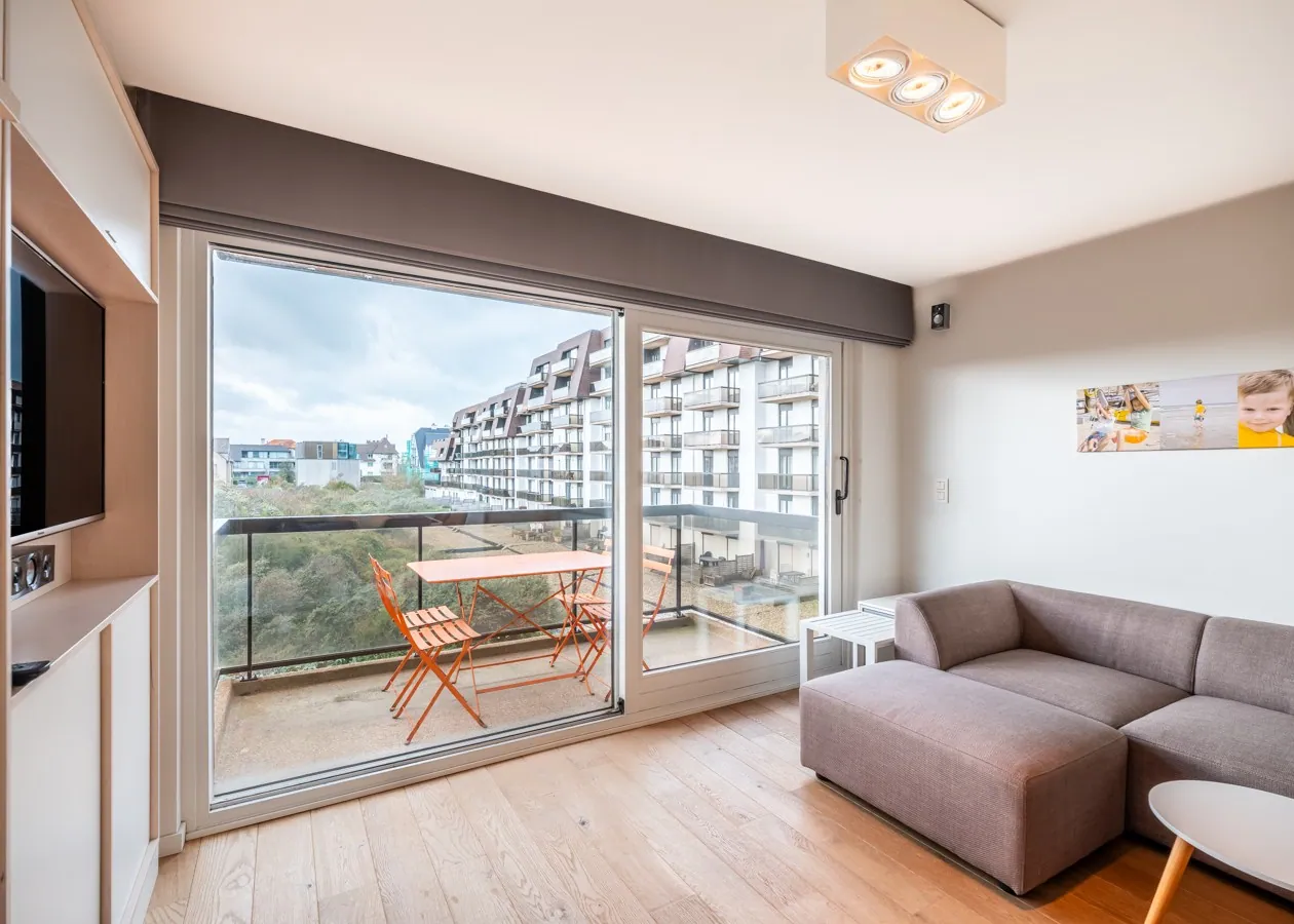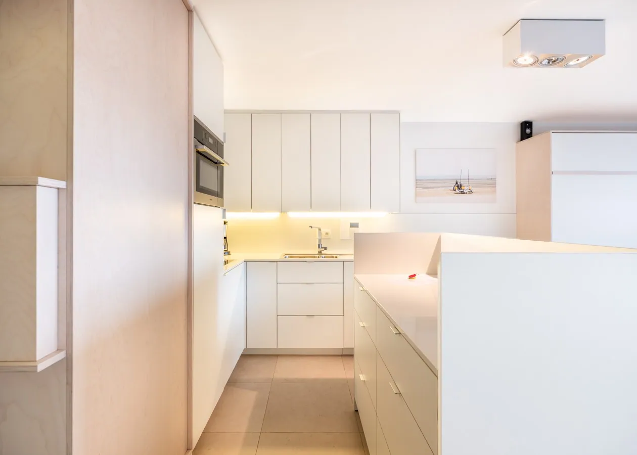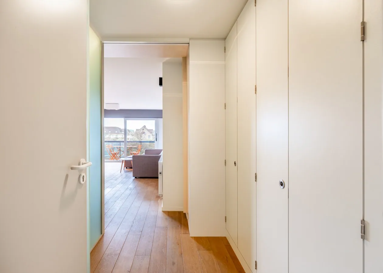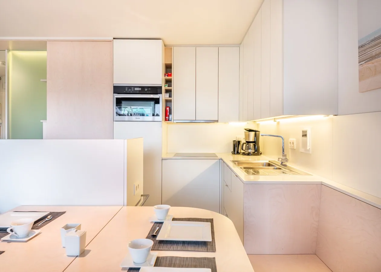 Das Wohnzimmer mit edlem Parkettboden öffnet sich nahtlos zur großen Sonnenterrasse hin. Dieses modern eingerichtete Studio in der zweiten Etage besticht durch seine Lage als Oase der Ruhe, nur wenige Schritte von der Strandpromenade und dem Meer entfernt. Die Schlafplätze für vier Personen verteilen sich auf ein Doppel-Schrankbett und eine Schlafnische mit Etagenbett. Eine voll ausgestattete Küche mit Geschirrspüler und ein Badezimmer mit Dusche vervollständigen die hochwertige Ausstattung.