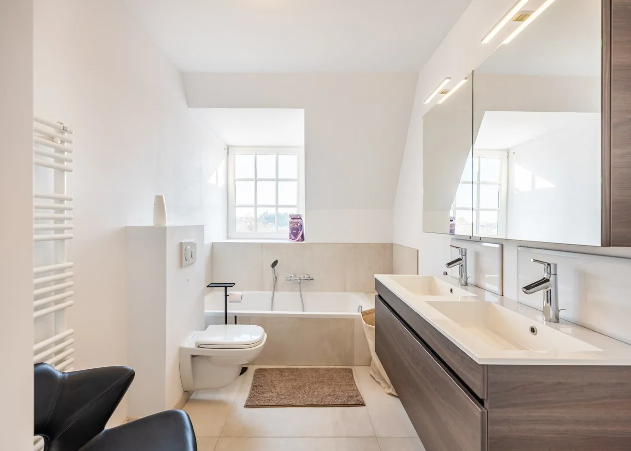 Dieses stilvoll eingerichtete Appartement im ersten Stock verfügt über ein sonniges Wohnzimmer mit angrenzender Terrasse und eine modern ausgestattete Küche. Die Aufteilung umfasst zwei Schlafzimmer: Das erste Zimmer ist mit einem Doppelbett sowie einem Etagenbett ausgestattet und bietet Zugang zu einer zweiten Terrasse. Das zweite Schlafzimmer verfügt über ein Doppelbett und ein Bad en Suite. Neben einem Badezimmer mit Badewanne und Doppelwaschbecken bietet die Wohnung ein separates WC sowie einen Hauswirtschaftsraum mit Waschmaschine und Trockner. Ein großzügiger Parkplatz unter dem Gebäude ist inbegriffen, und auch Ihre vierbeinigen Lieblinge sind hier herzlich willkommen.