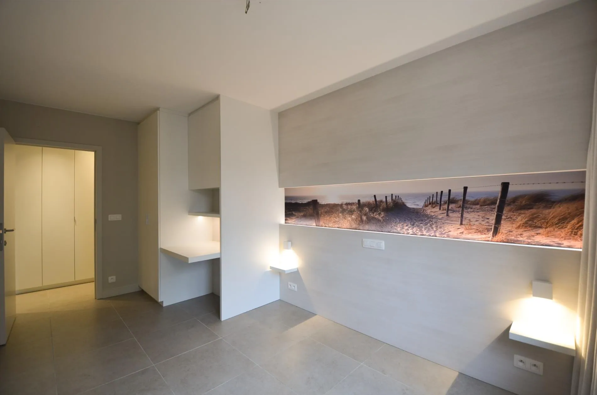 Slaapkamer één is voorzien van ingemaakte kasten en geeft uit op een klein terras. Slaapkamer twee beschikt eveneens over ingemaakte kasten en een bureau.