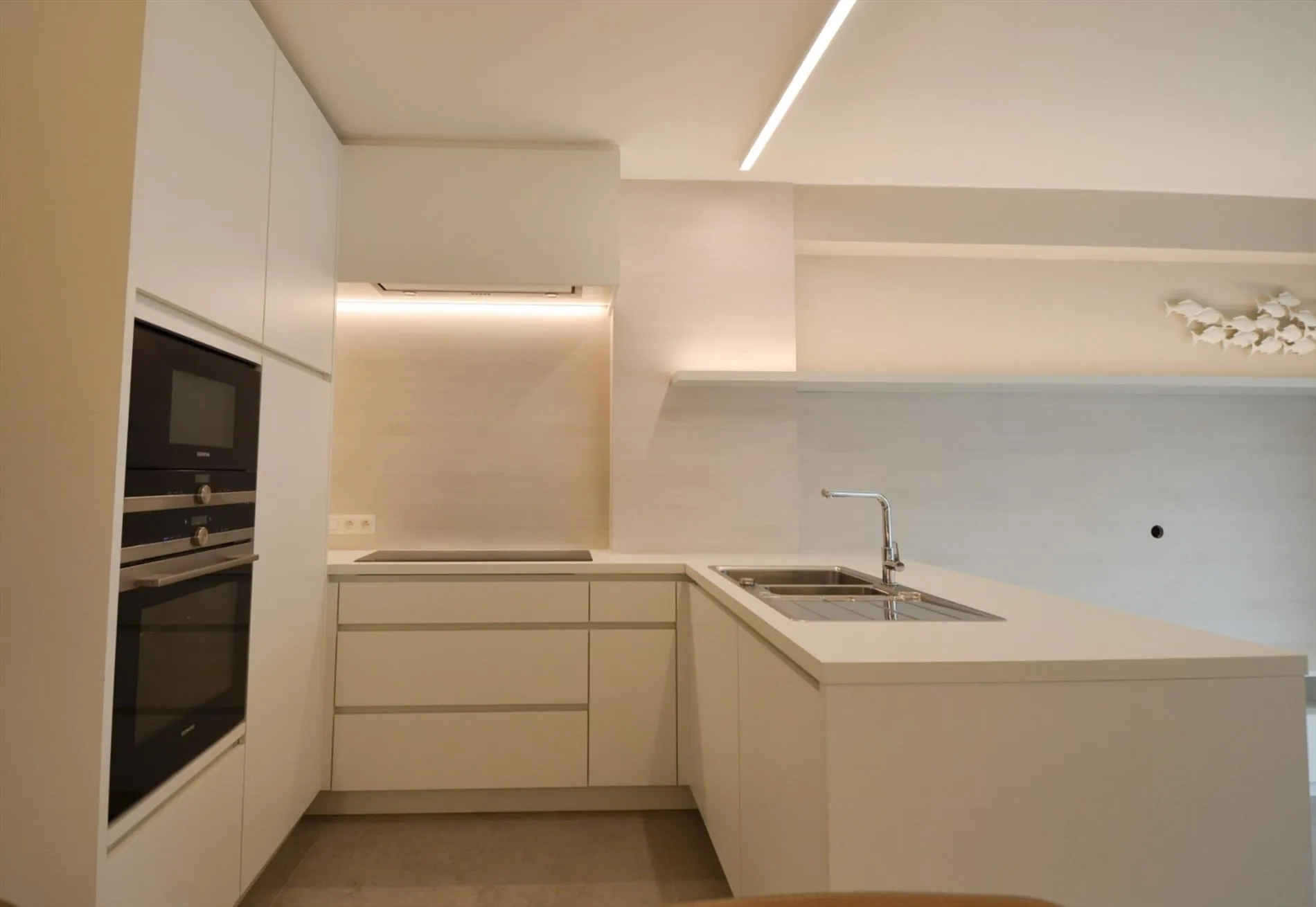Het appartement is voorzien van een open luxe-keuken. De ruime living heeft een terras met zicht op het Fabiolaplein