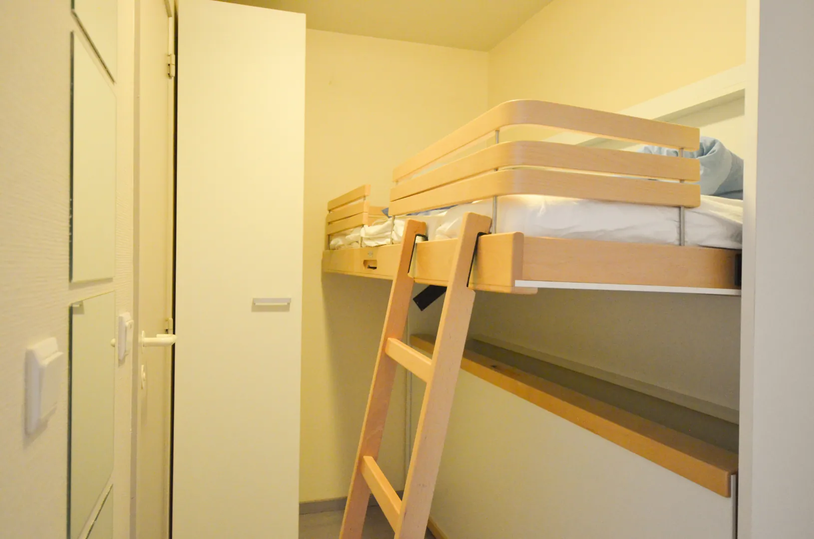 Het appartement werd als volgt ingedeeld: Inkomhal | slaaphoek | apart toilet | open keuken | leefruimte | badkamer | terras.