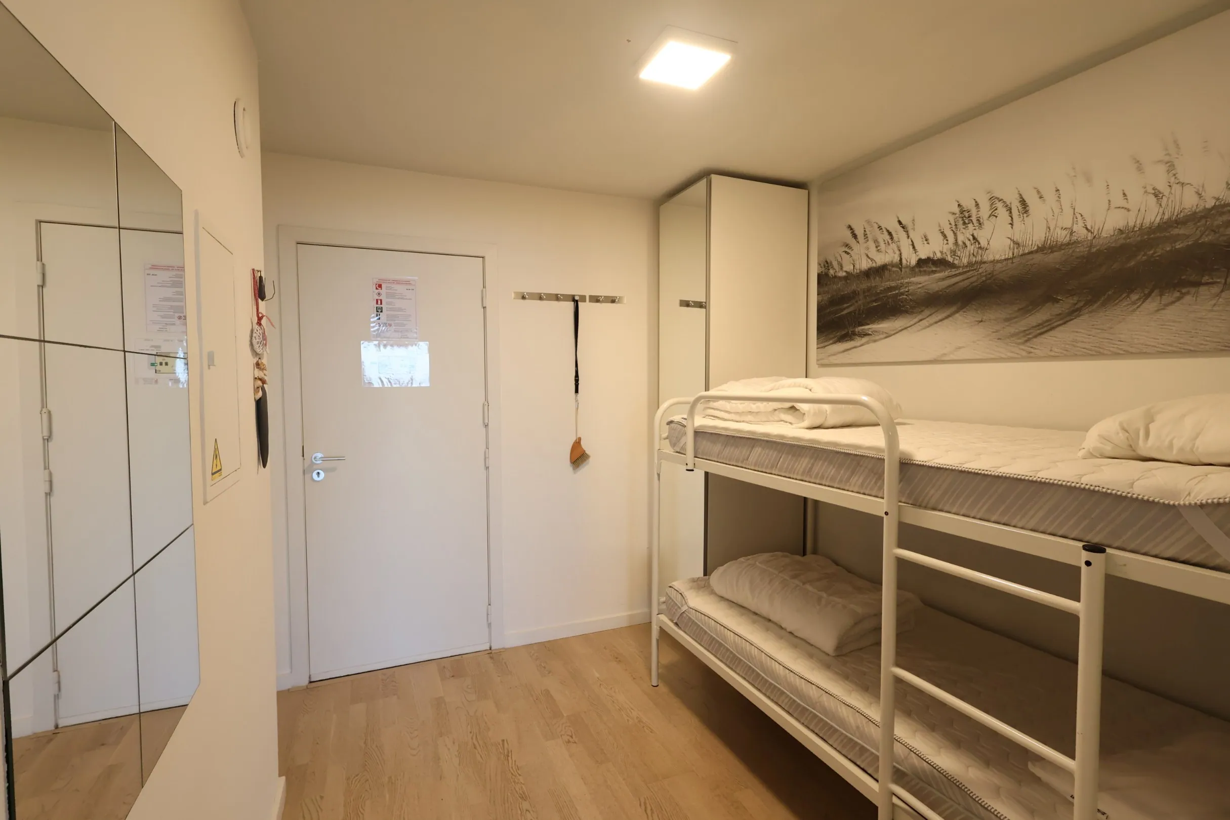 Inkomhal met stapelbed | vernieuwe badkamer met douche, lavabo en toilet | ruime living met open keuken | terras met zeezicht en berging.