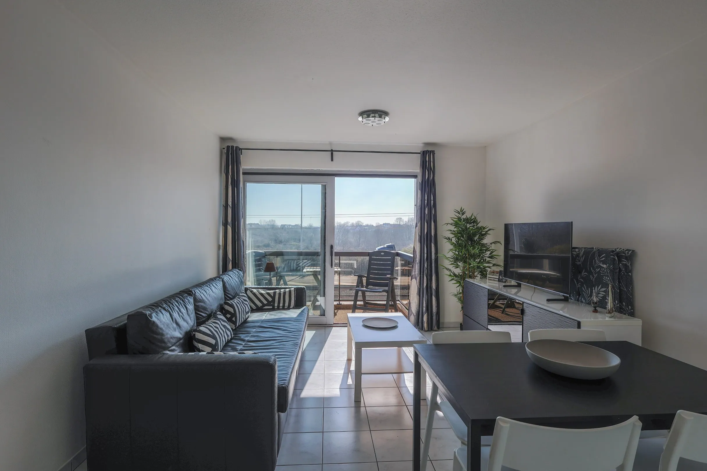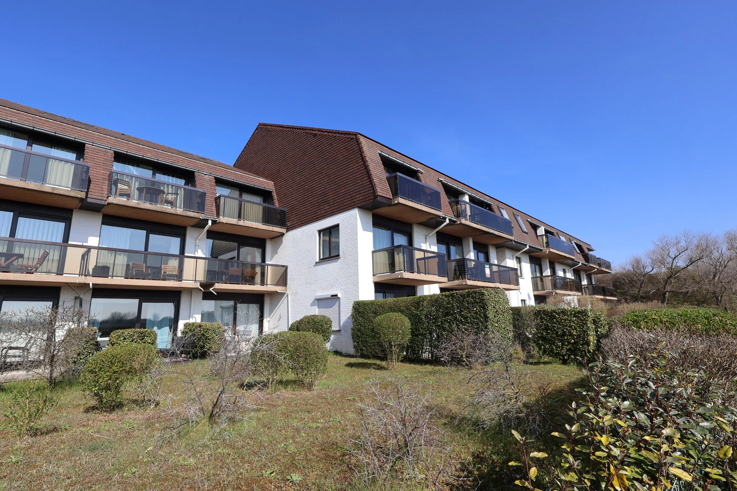woonkamer met open keuken | badkamer met douche, lavabo en toilet | zonnig terras met zicht op beschermd duinengebied. Private kelder in de -1 van deze residentie.