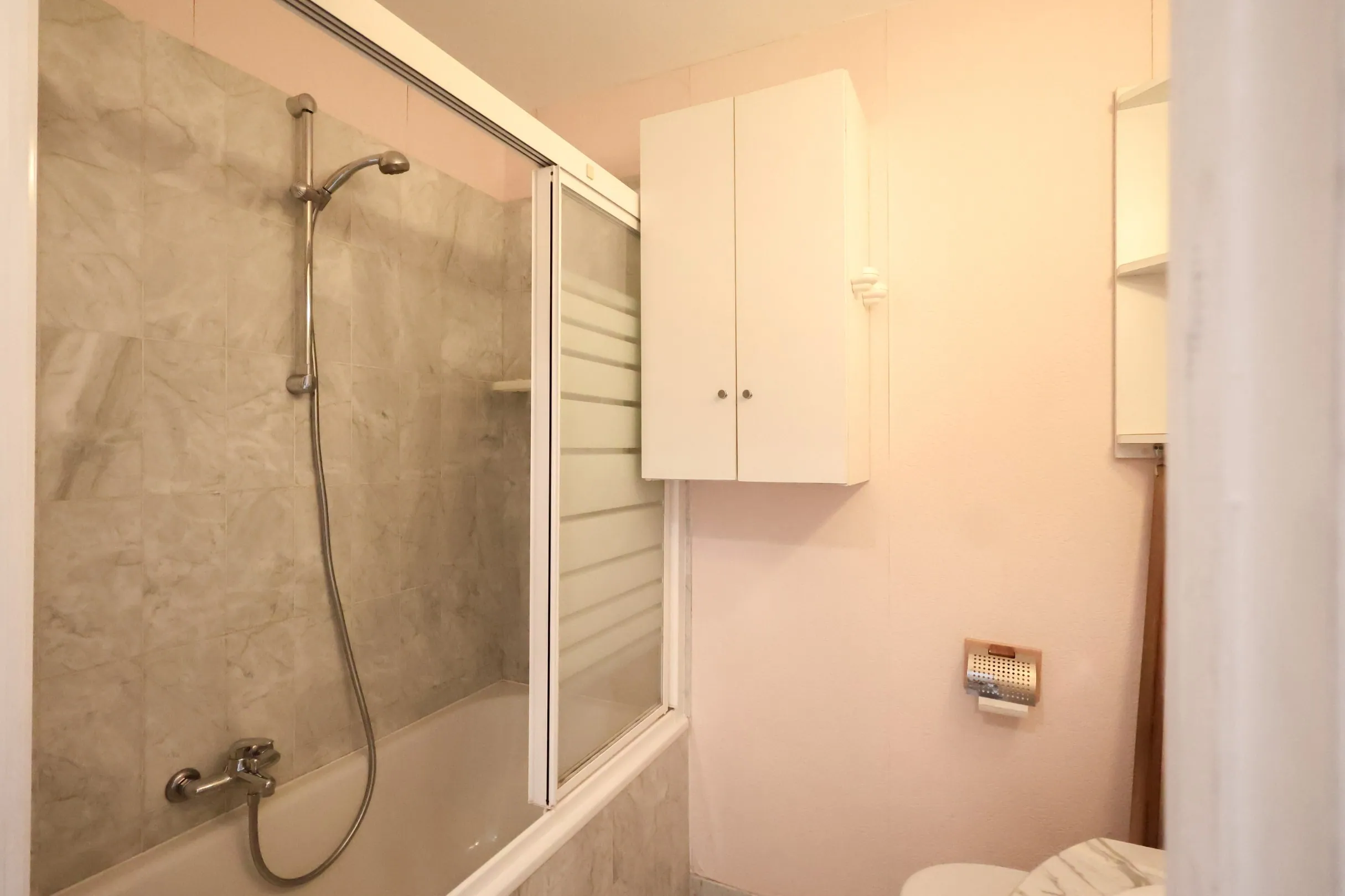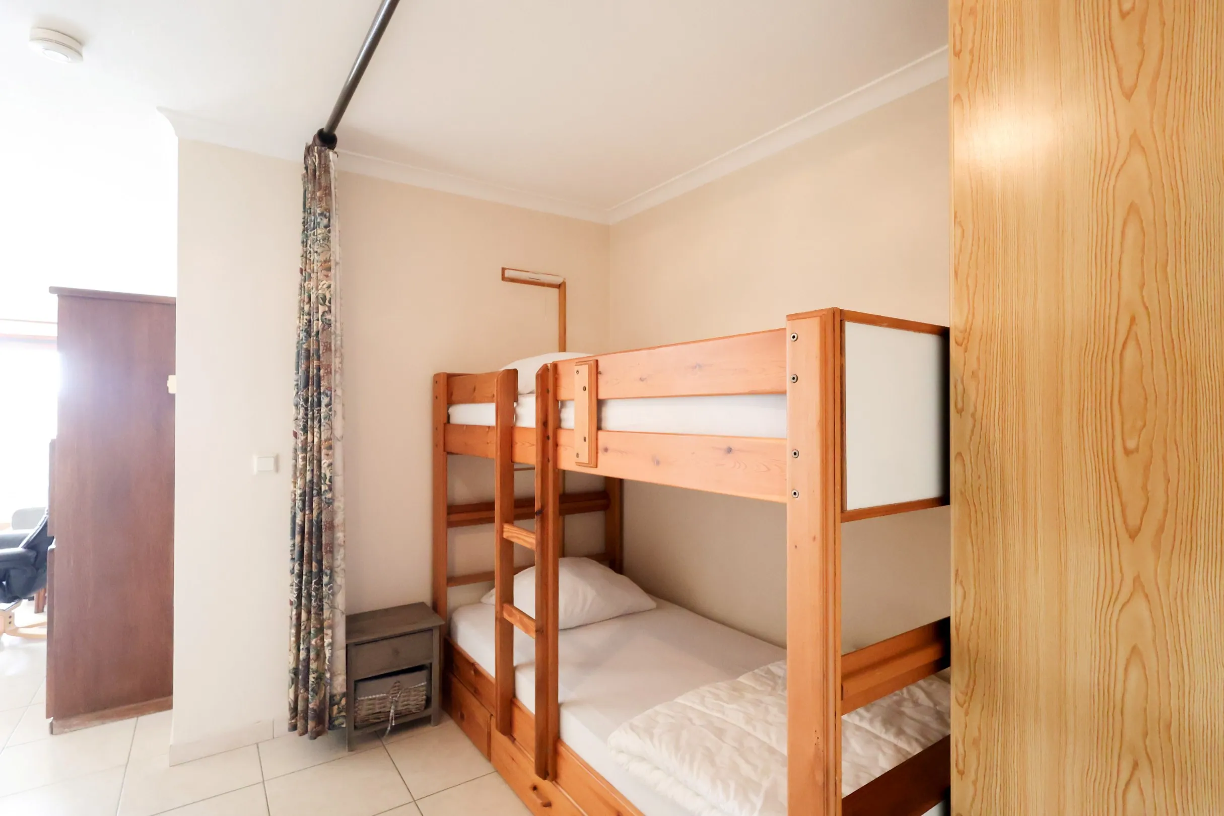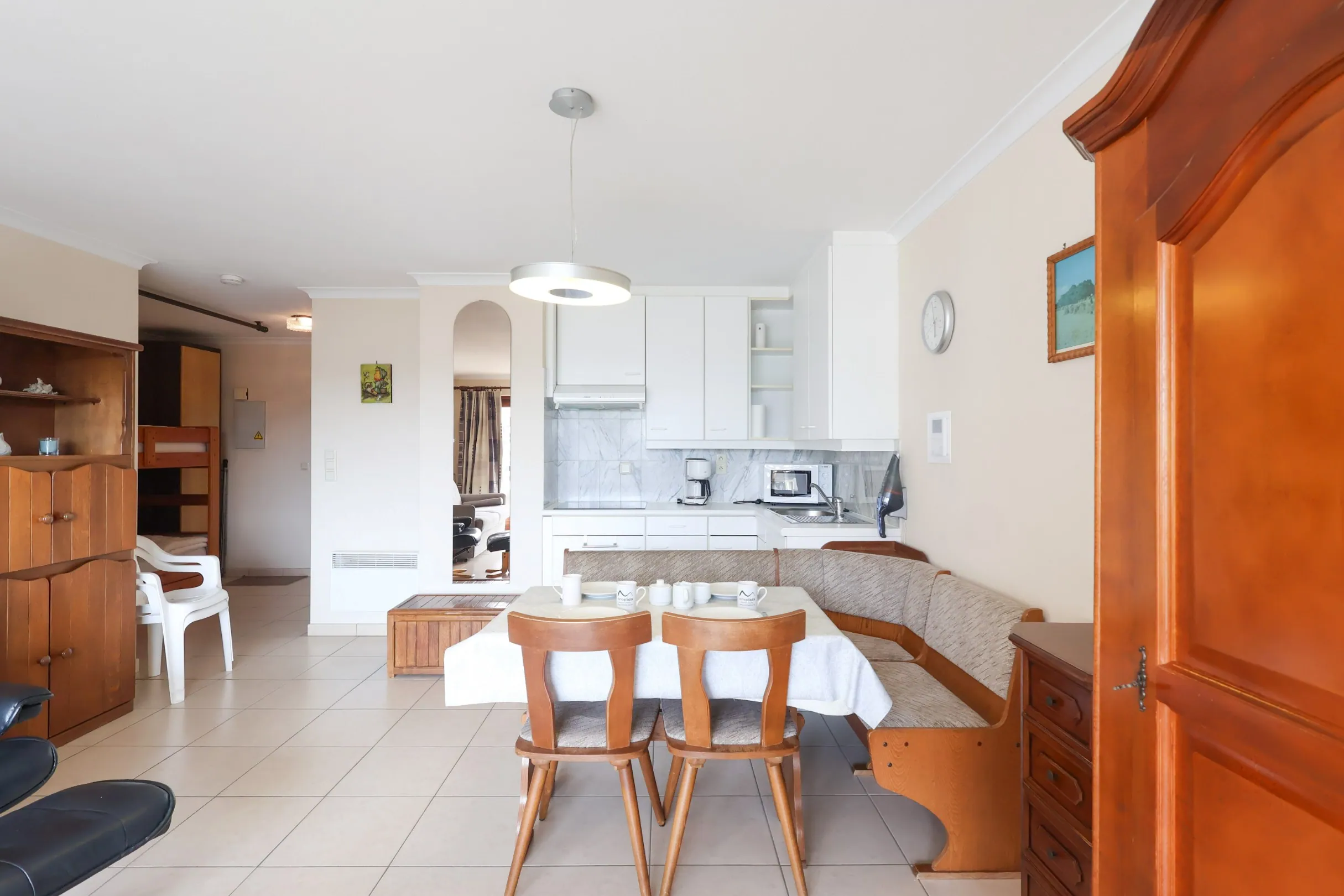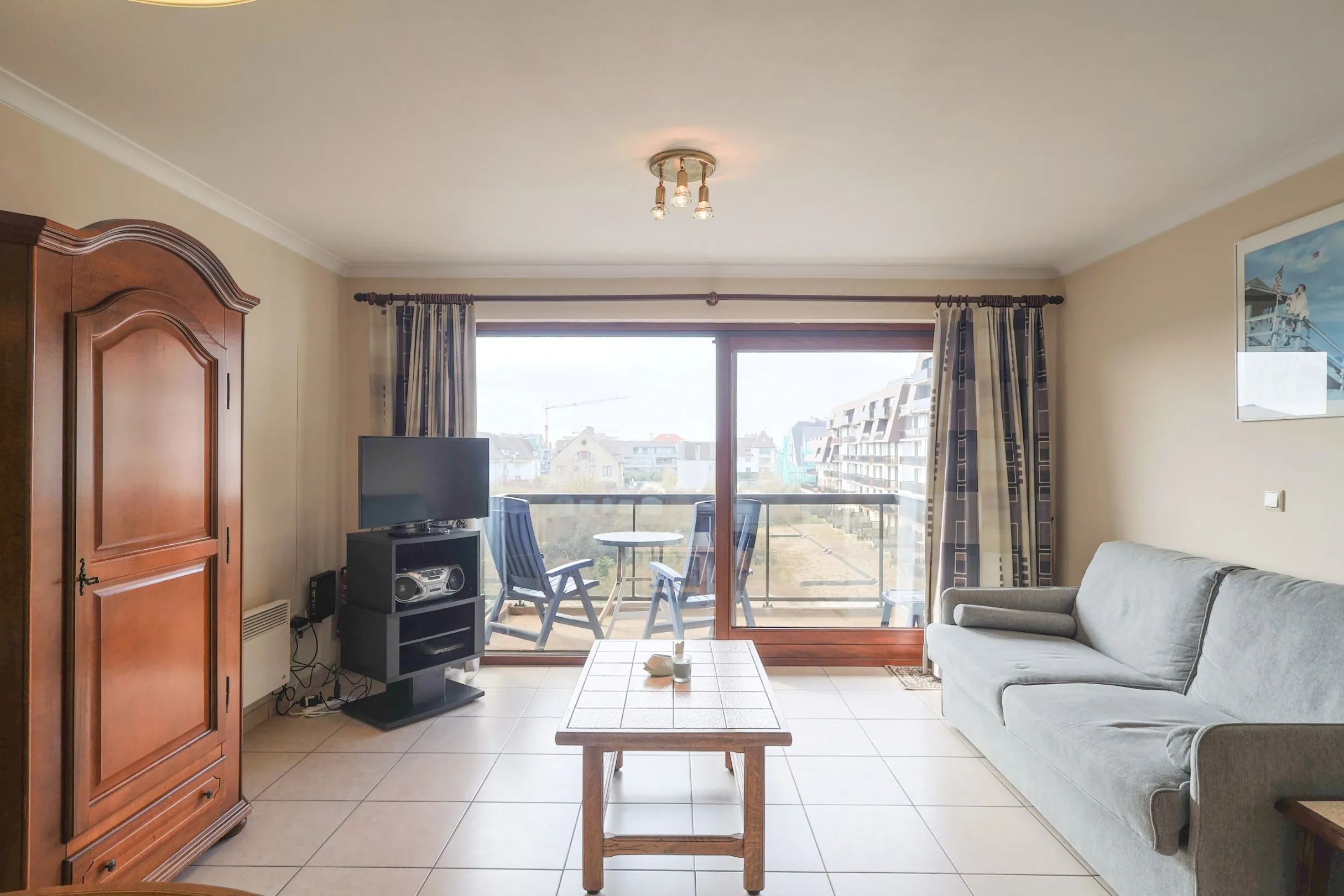 Deze functioneel ingedeelde studio is gelegen in de Residentie Oostduinkerke Plaza I en beschikt over een leefruimte met open keuken die uitgeeft op een zonnig terras met zicht op de duinen aan de achterzijde van het gebouw. De praktische slaaphoek bevindt zich in de gang en zorgt voor een efficiënte indeling. De badkamer is voorzien van een bad, lavabo en toilet.