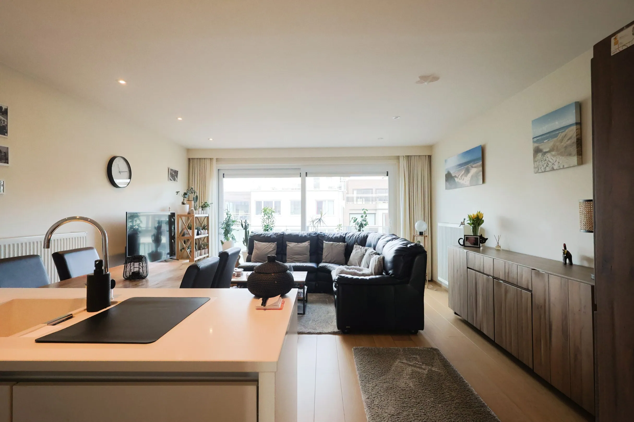 De woonkamer geniet van veel natuurlijke lichtinval en sluit naadloos aan op de moderne open keuken met berging, wat zorgt voor een open en gezellige sfeer.