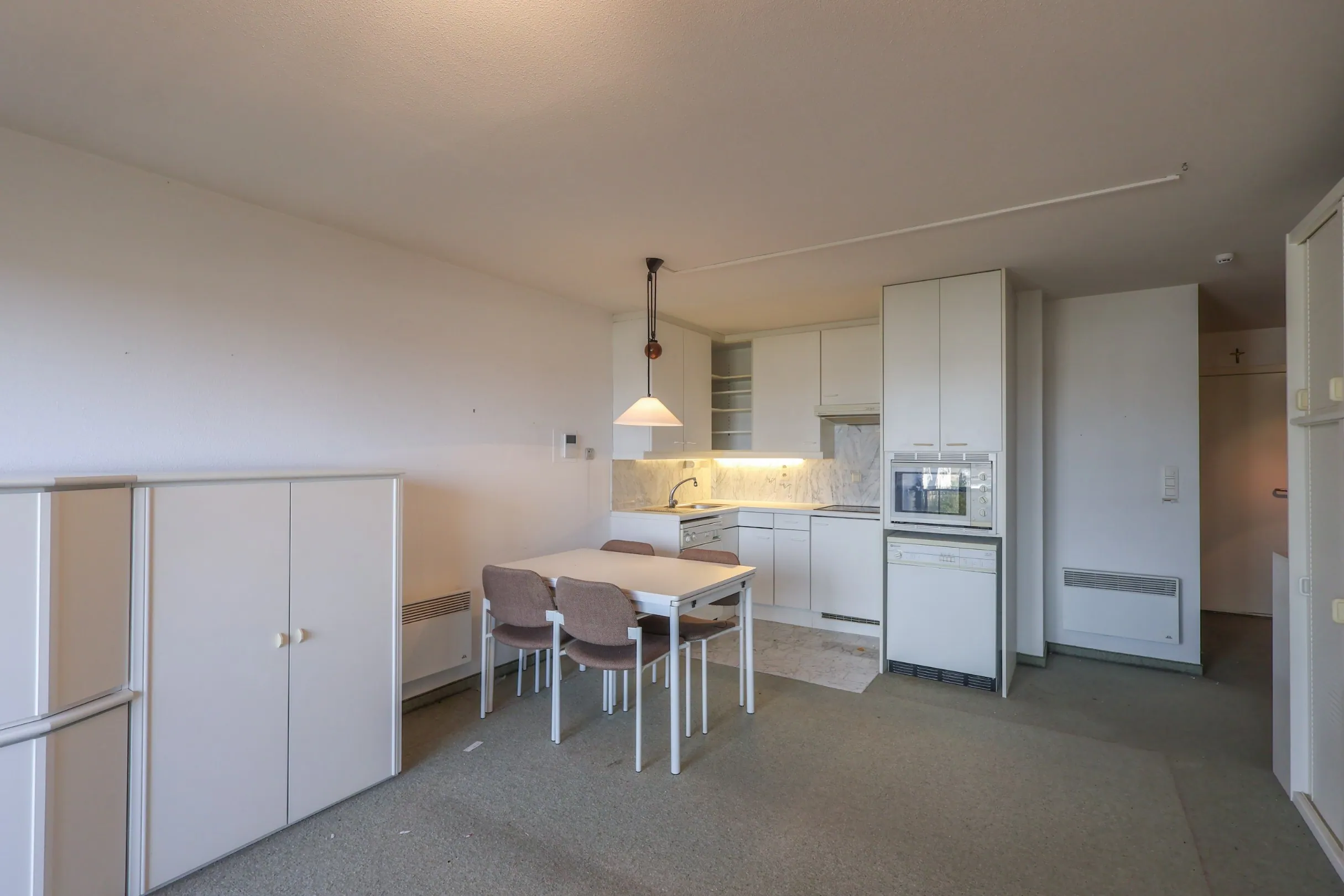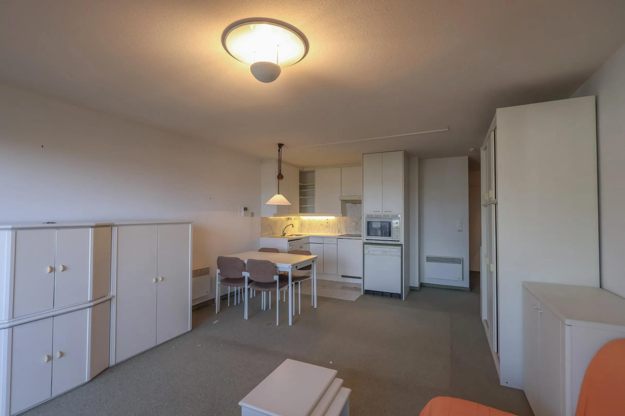 Disposition: hall d'entrée avec coin nuit, salon spacieux avec accès à la terrasse ensoleillée et 2 pratiques débarras, cuisine ouverte et une salle de bains avec baignoire, lavabo et toilettes.