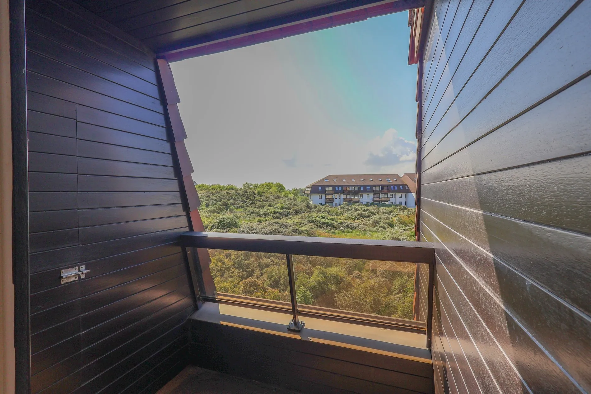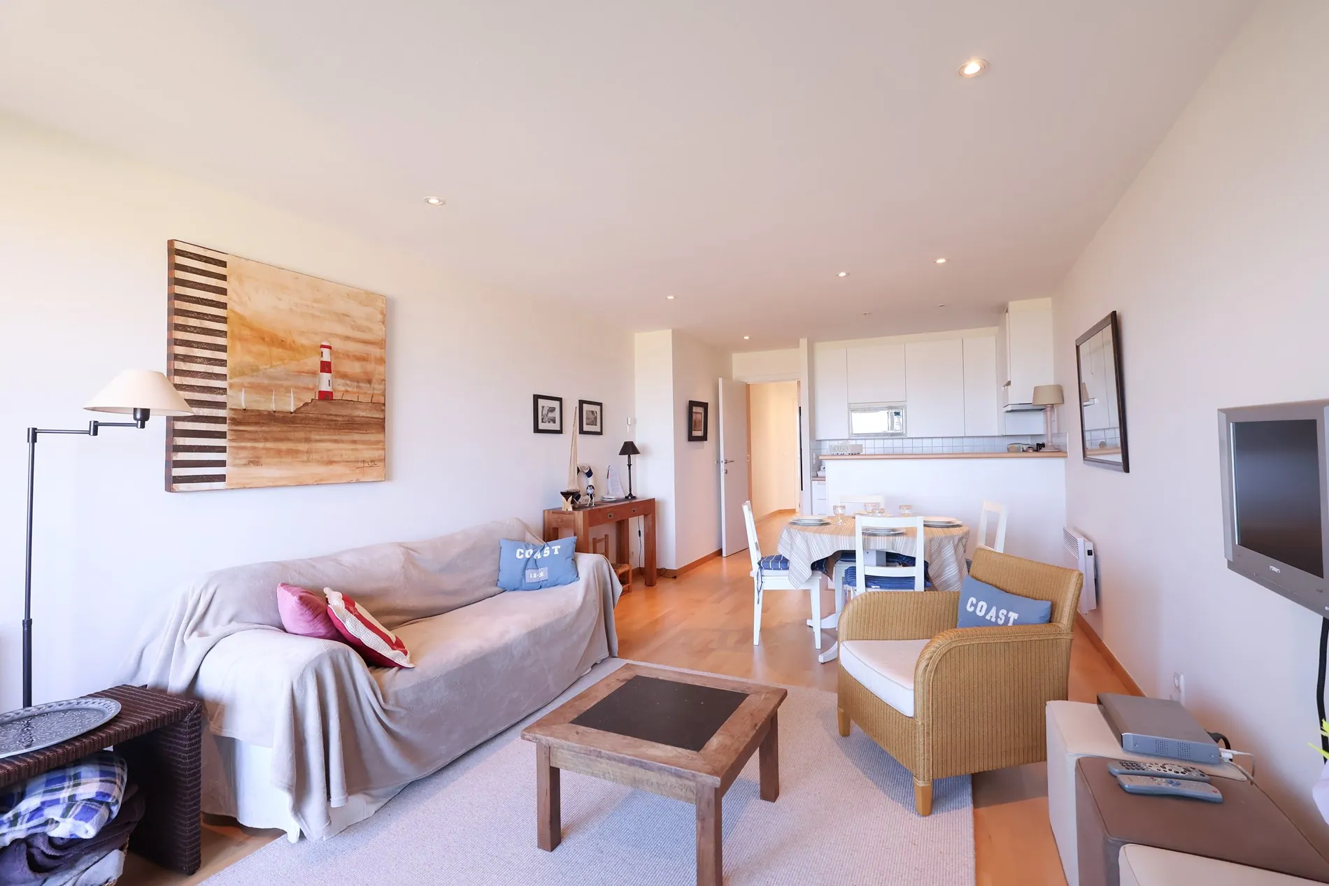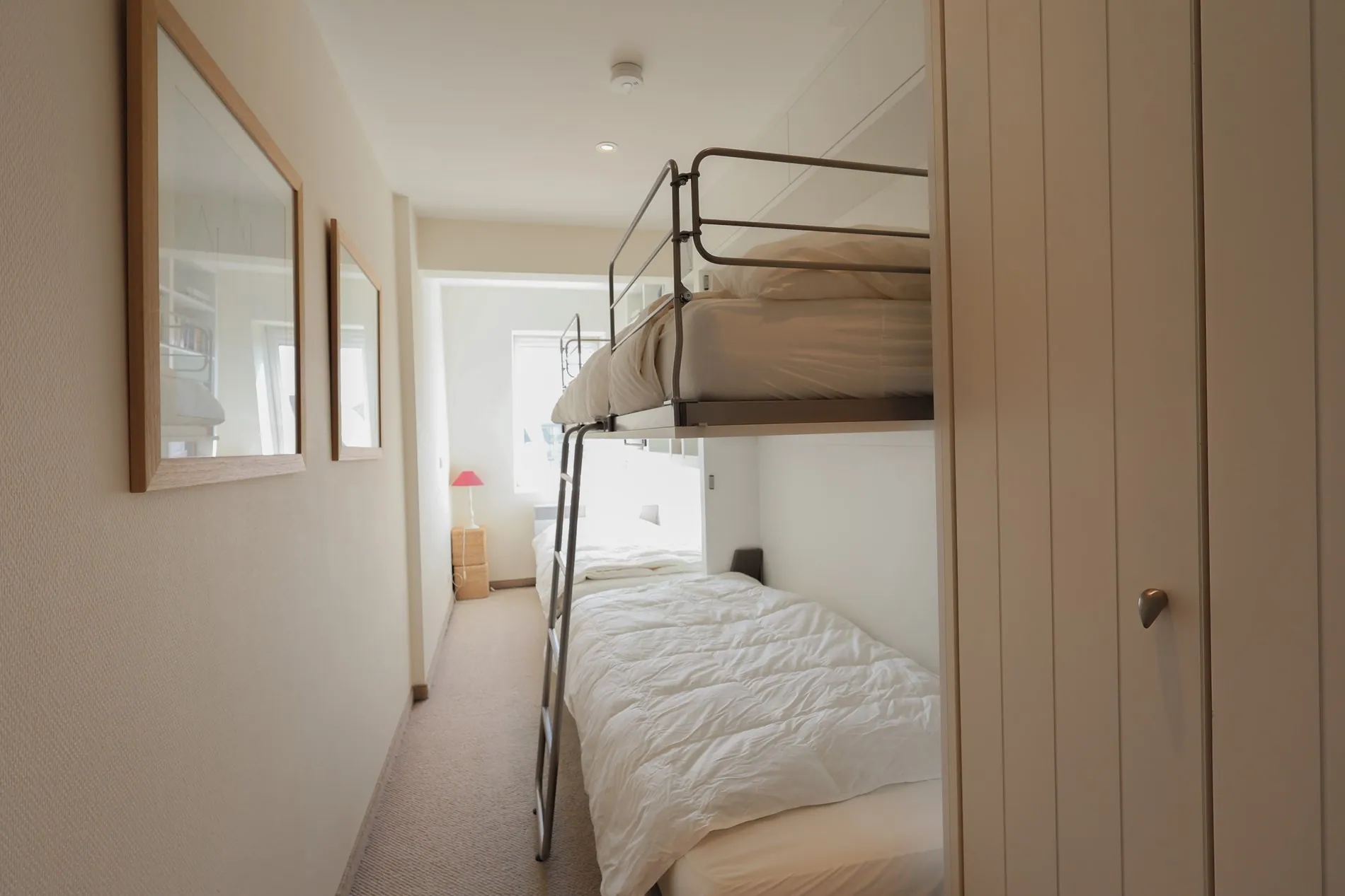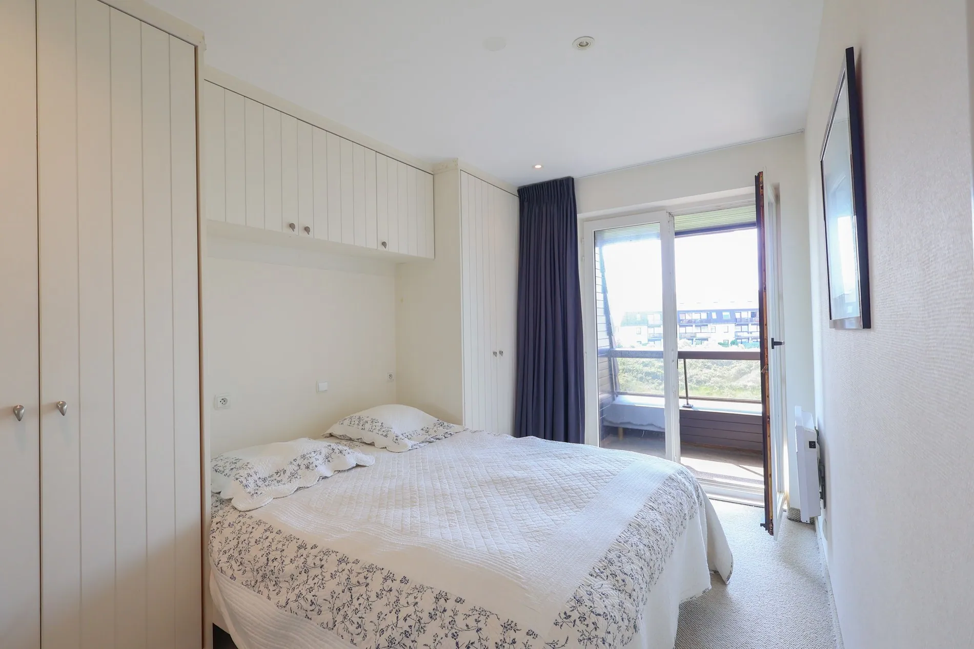 De knusse leefruimte met parketvloer biedt een frontaal zicht op de zee, het strand en de duinen. In de slaapkamers zorgt een zacht voltapijt voor een warm gevoel; hier bevinden zich een tweepersoonsbed en een stapelbed. Met twee balkons, een badkamer met ligbad en een privéparking in het gebouw zijn alle troeven aanwezig voor een zorgeloos verblijf.