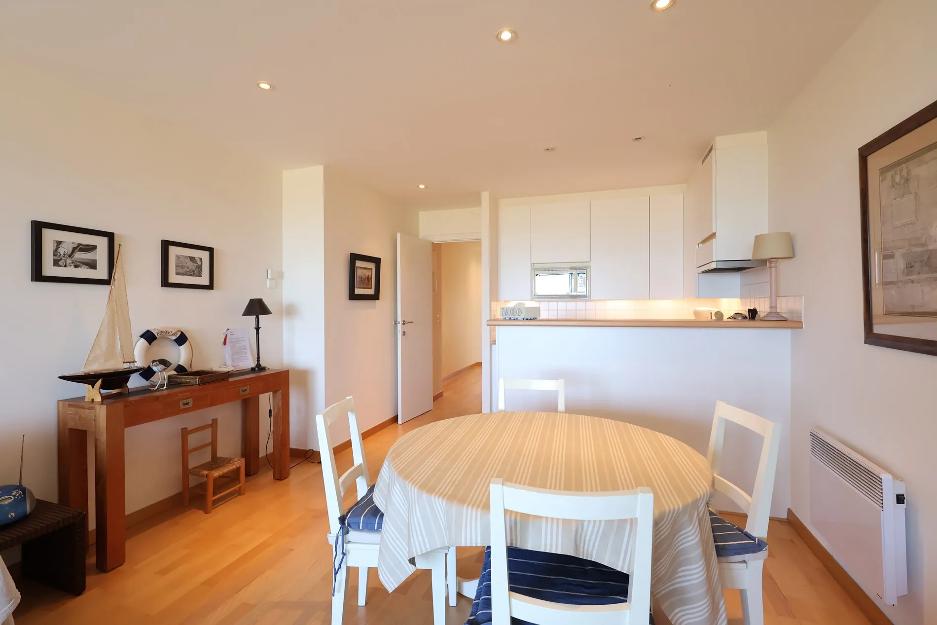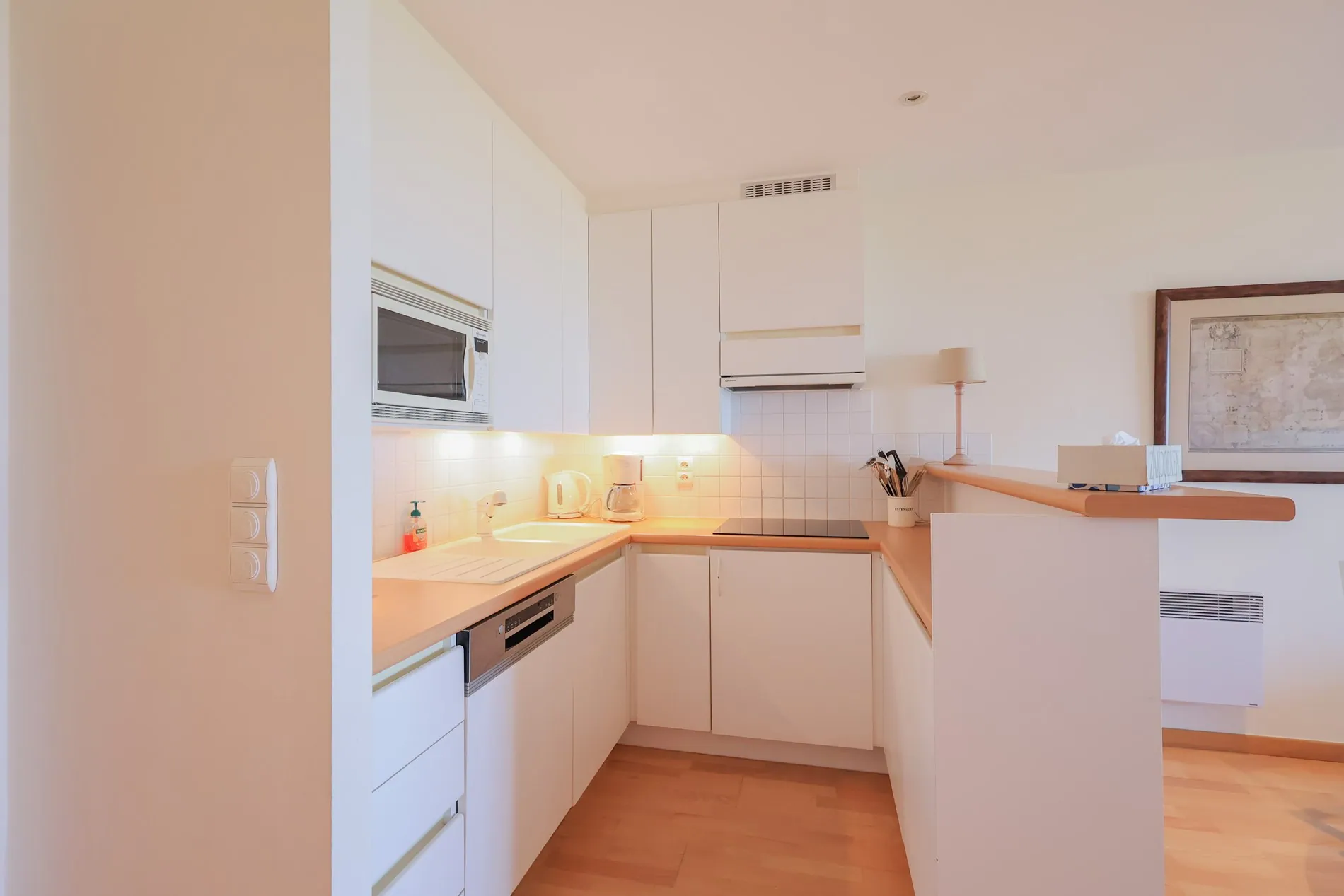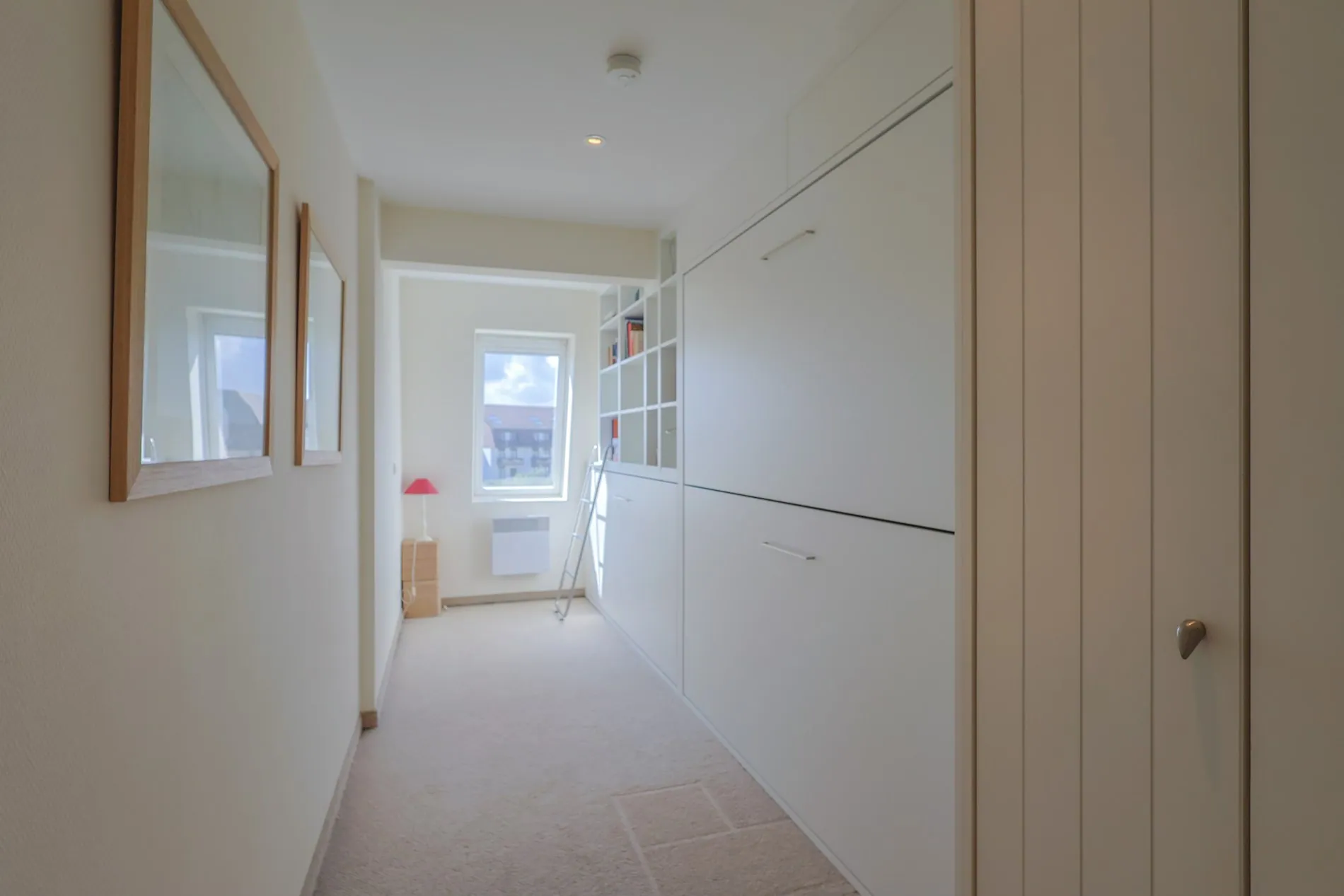 De knusse leefruimte met parketvloer biedt een frontaal zicht op de zee, het strand en de duinen. In de slaapkamers zorgt een zacht voltapijt voor een warm gevoel; hier bevinden zich een tweepersoonsbed en een stapelbed. Met twee balkons, een badkamer met ligbad en een privéparking in het gebouw zijn alle troeven aanwezig voor een zorgeloos verblijf.