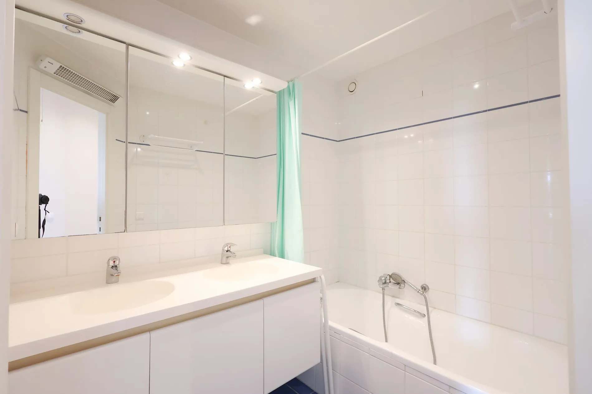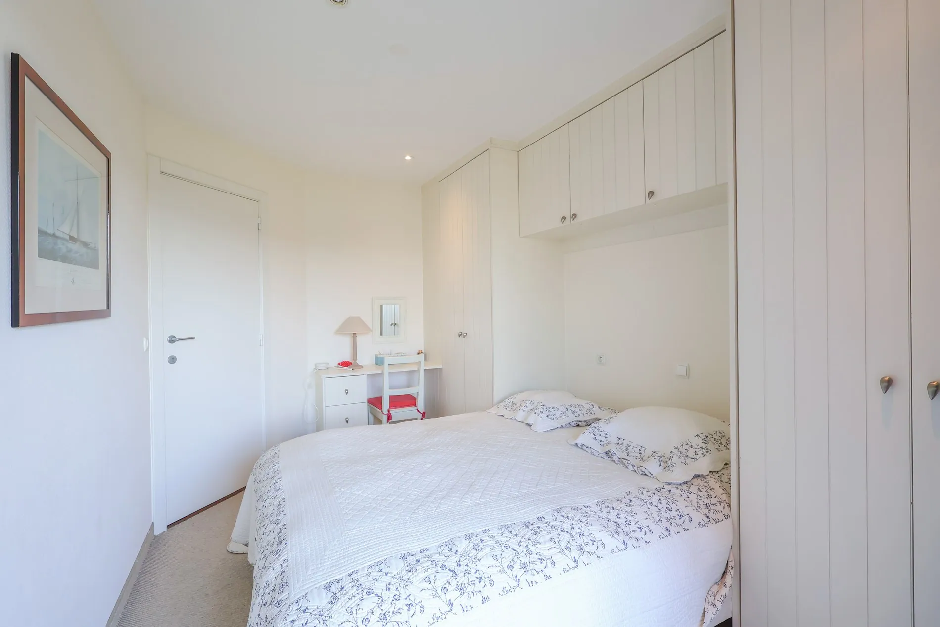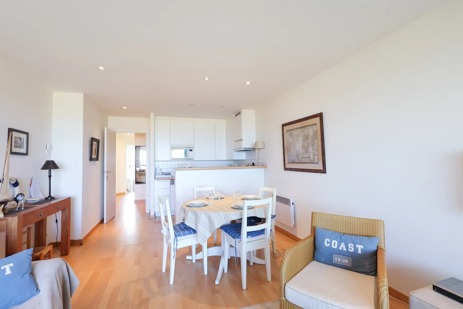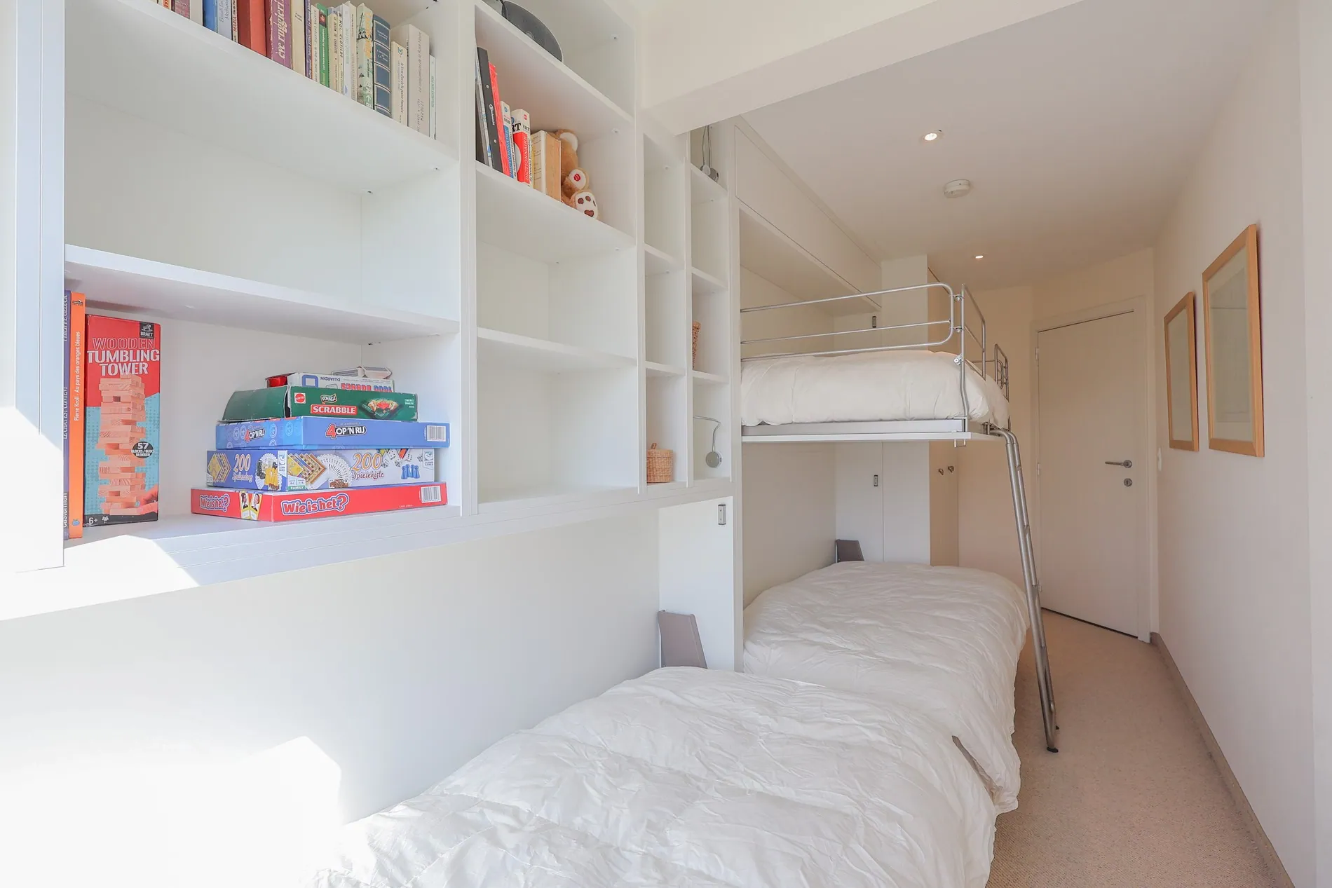 De knusse leefruimte met parketvloer biedt een frontaal zicht op de zee, het strand en de duinen. In de slaapkamers zorgt een zacht voltapijt voor een warm gevoel; hier bevinden zich een tweepersoonsbed en een stapelbed. Met twee balkons, een badkamer met ligbad en een privéparking in het gebouw zijn alle troeven aanwezig voor een zorgeloos verblijf.