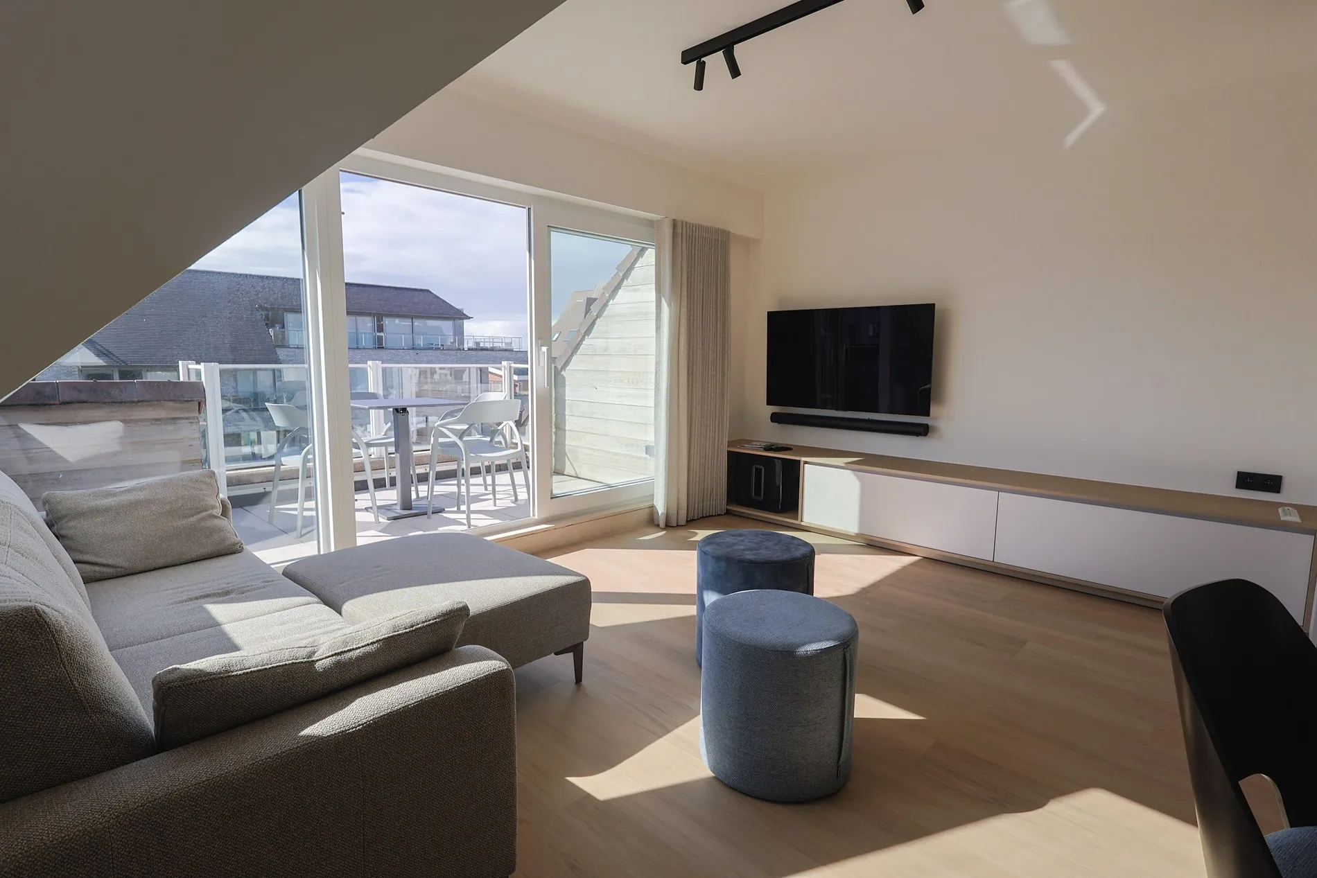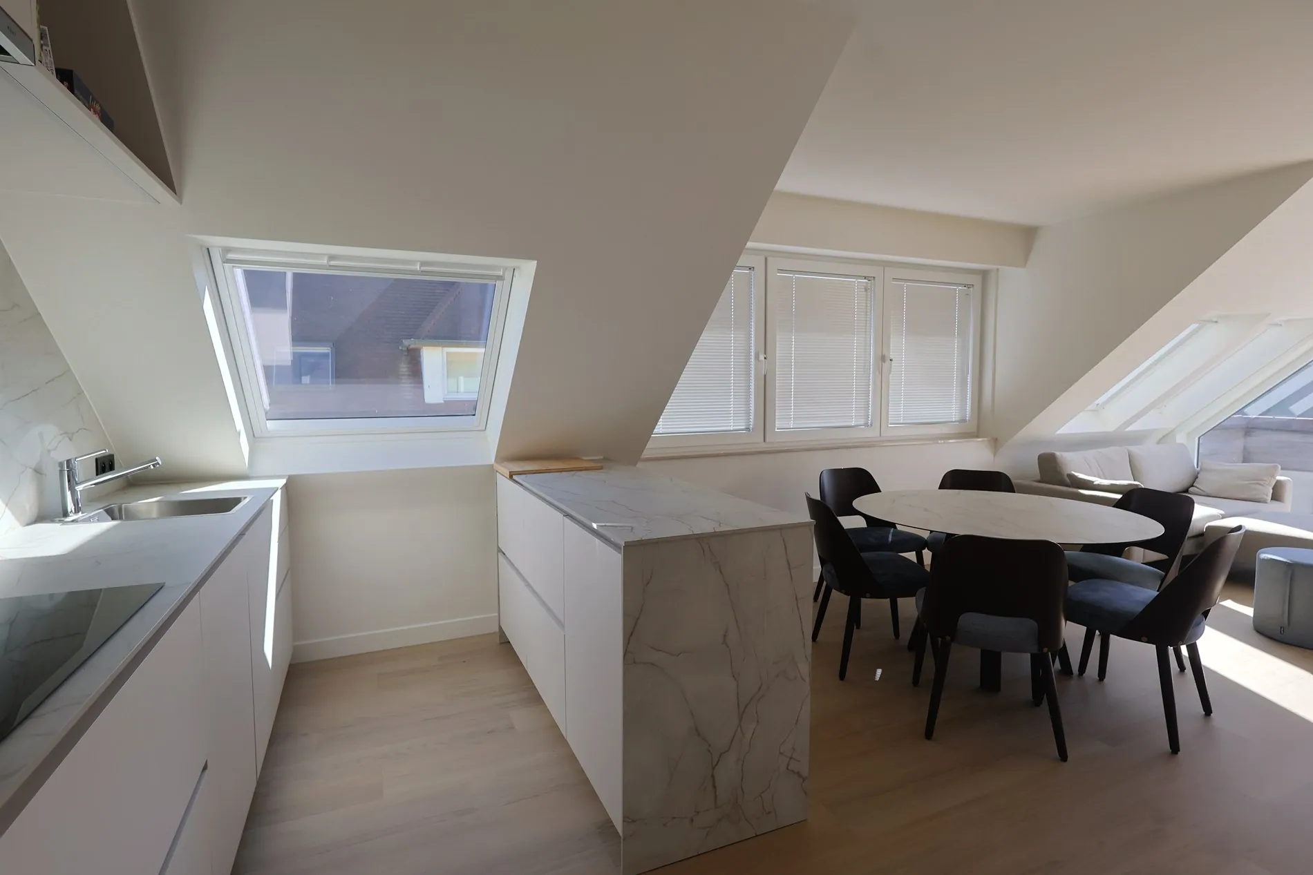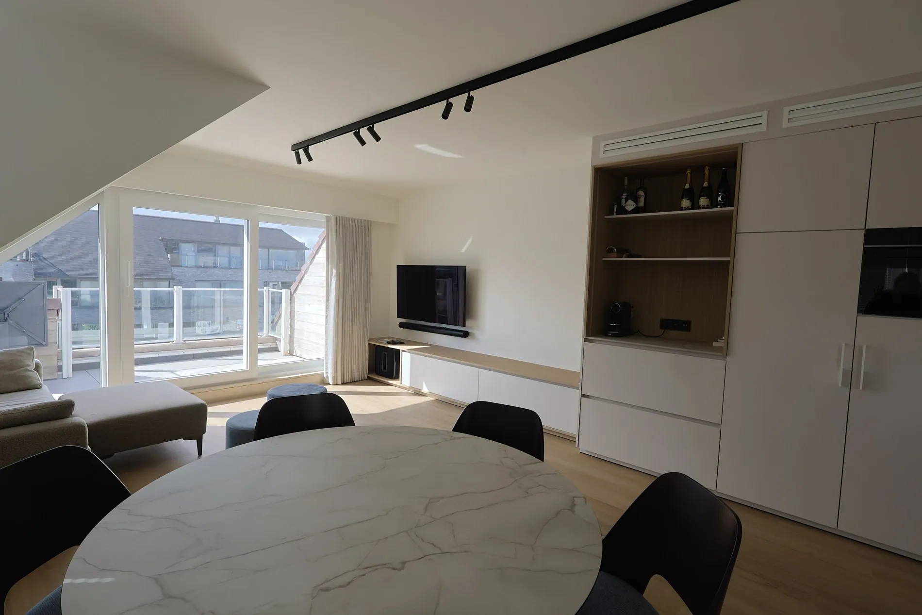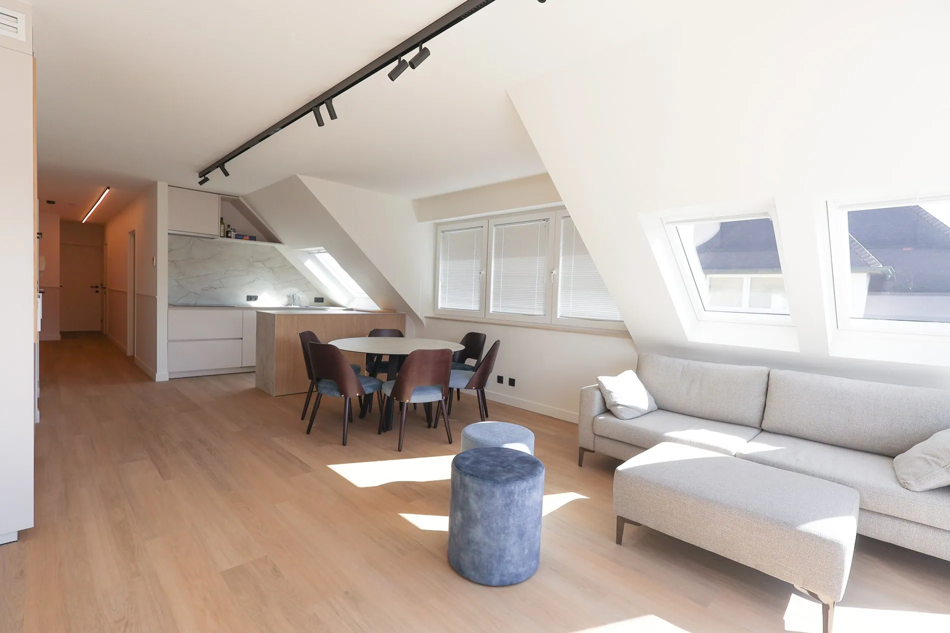 Warme parketvloeren en een verfijnde afwerking typeren dit appartement op de tweede verdieping. De leefruimte sluit aan op een zonnig terras met een zijdelings zeezicht. De indeling met twee slaapkamers, een badkamer met ligbad én een aparte douchekamer garandeert een hoogstaand comfort. Een private garagebox onder het gebouw is inbegrepen. Met zowel de zeedijk als het centrum van Oostduinkerke vlakbij, betreft dit een toplocatie.