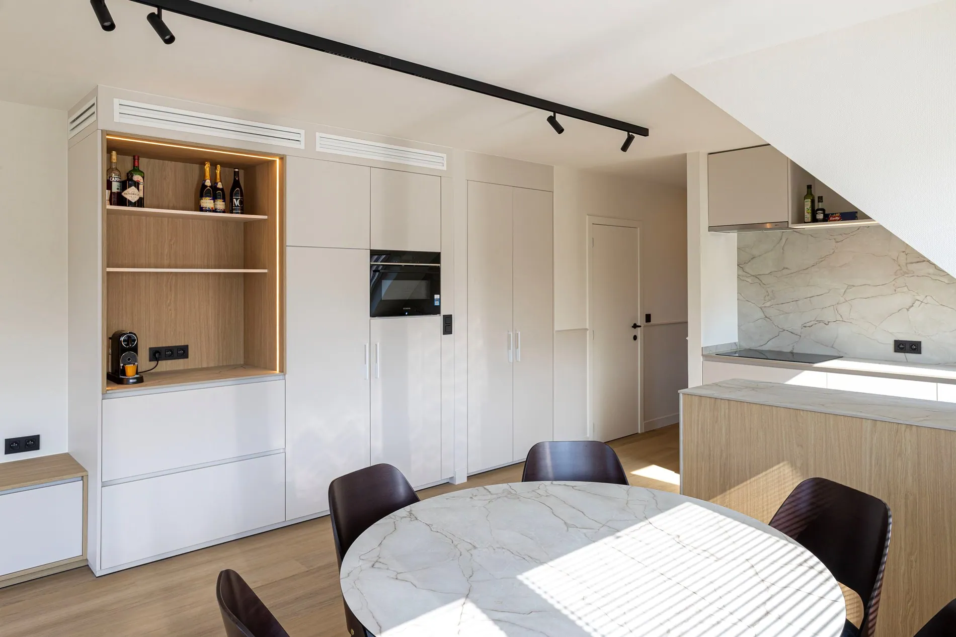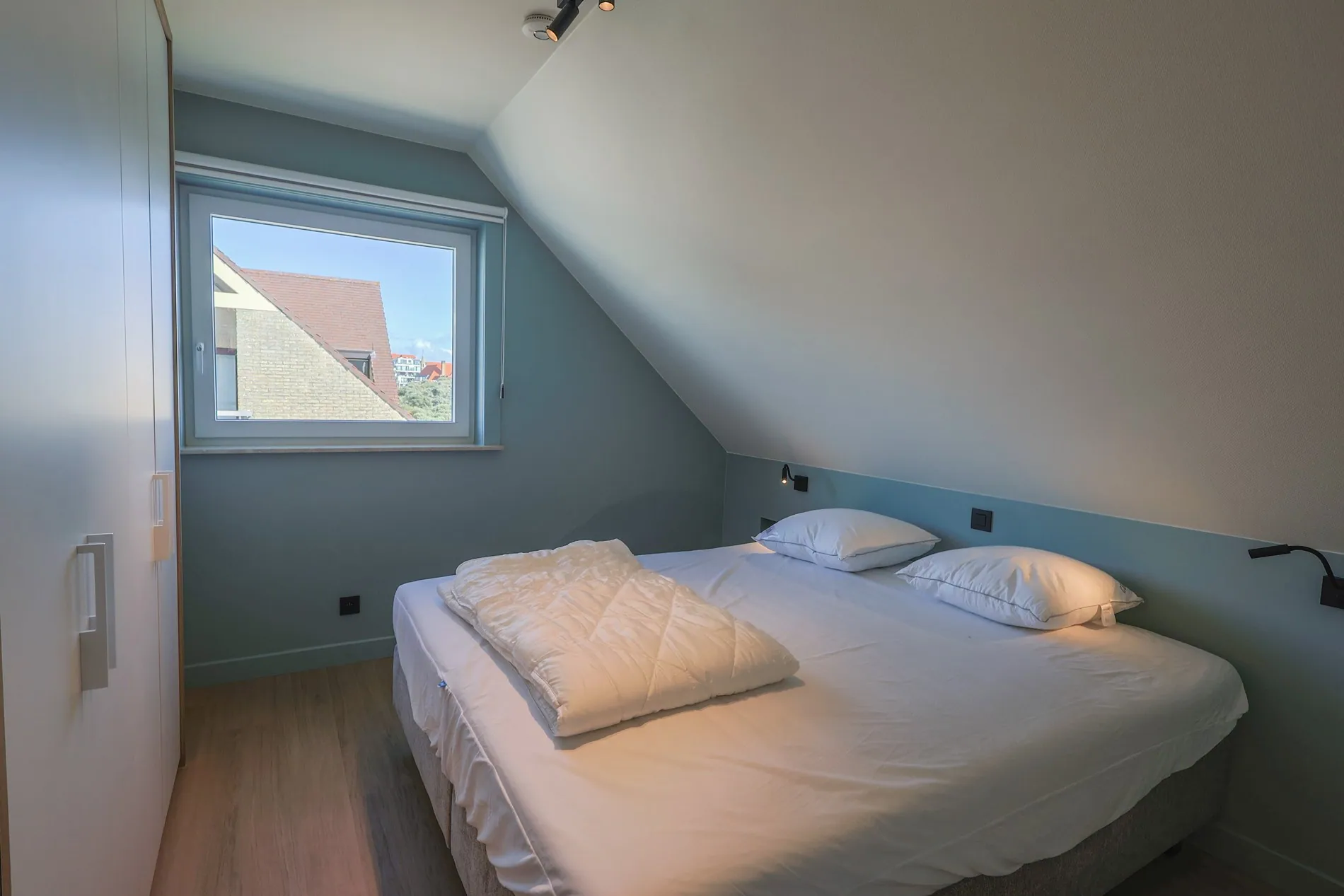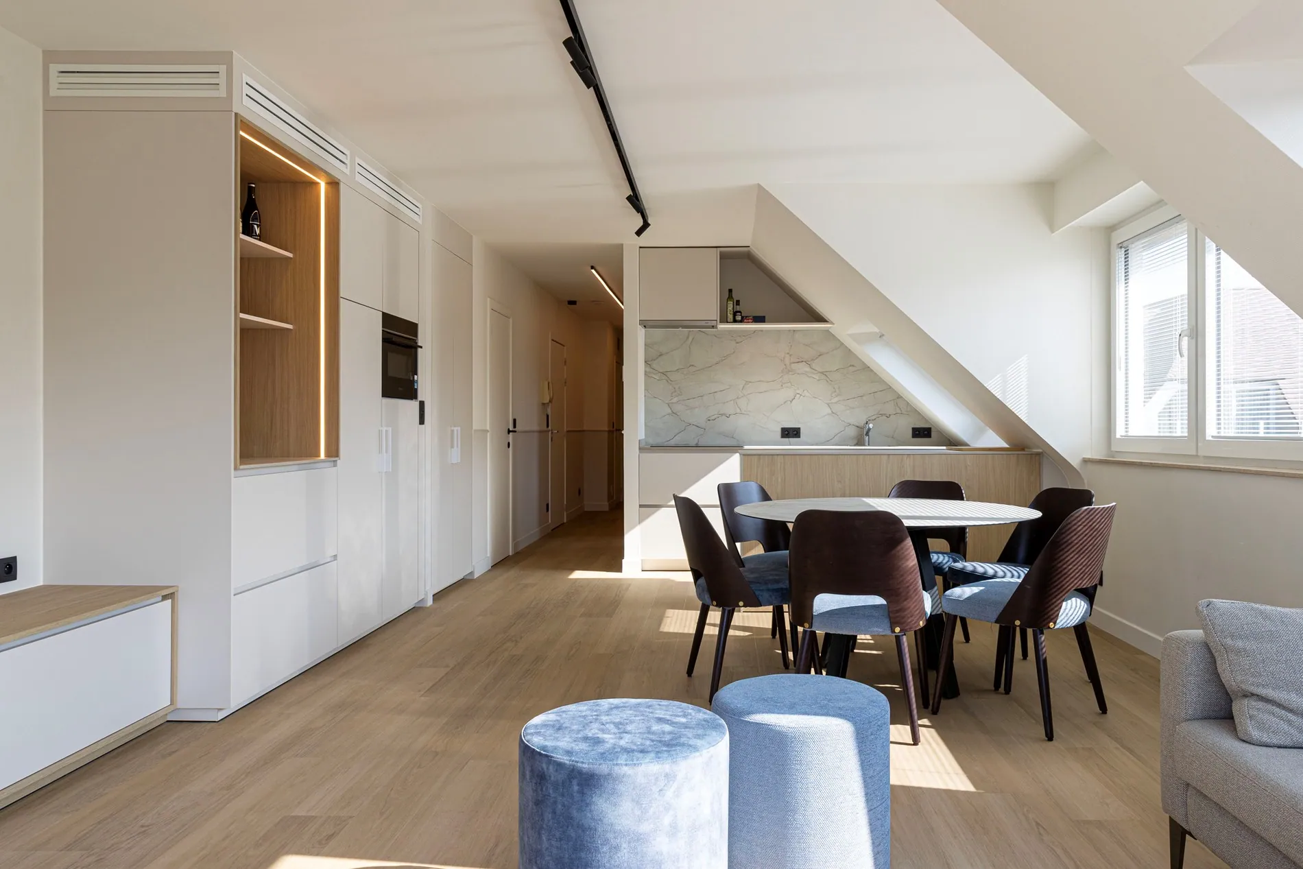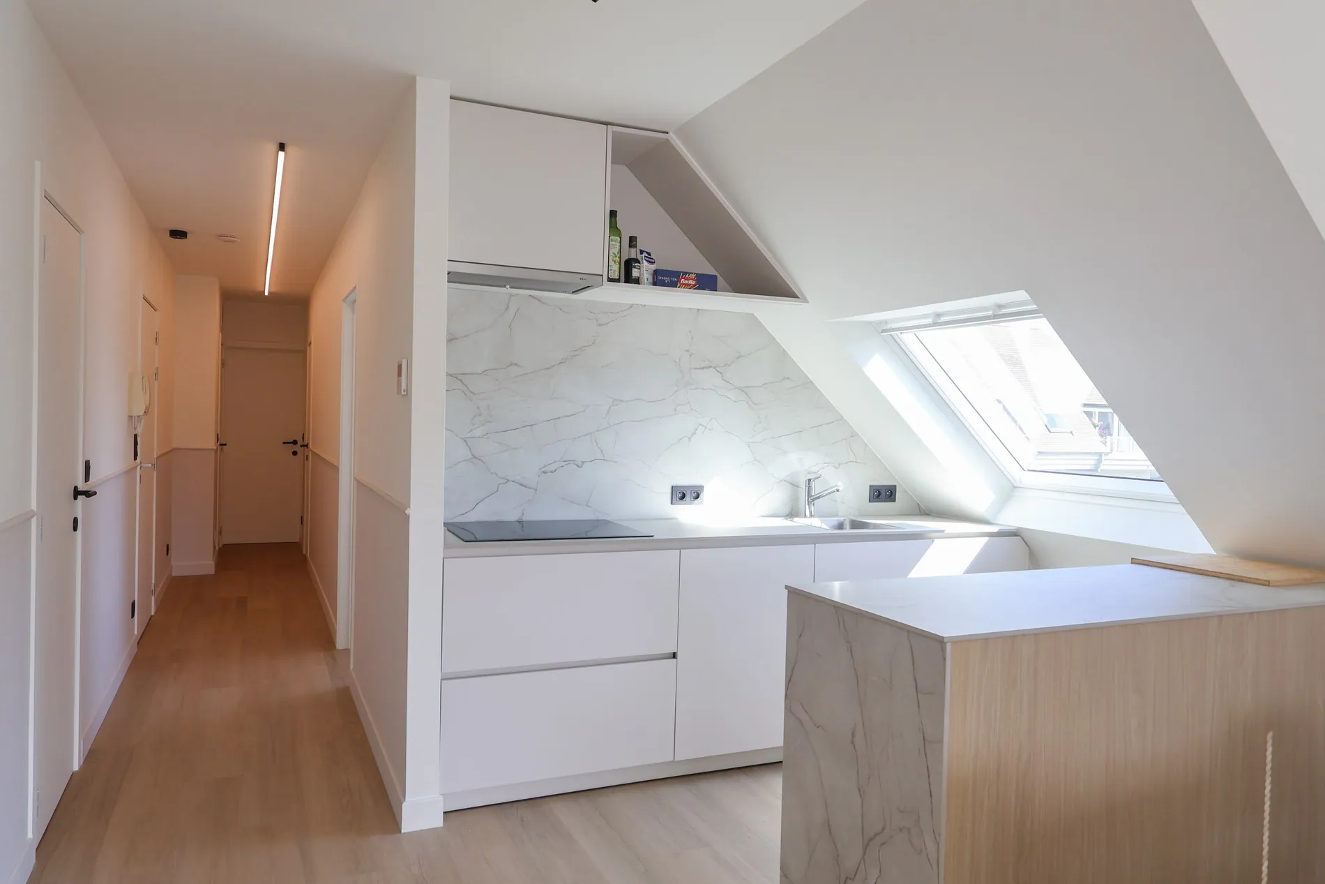 Warme parketvloeren en een verfijnde afwerking typeren dit appartement op de tweede verdieping. De leefruimte sluit aan op een zonnig terras met een zijdelings zeezicht. De indeling met twee slaapkamers, een badkamer met ligbad én een aparte douchekamer garandeert een hoogstaand comfort. Een private garagebox onder het gebouw is inbegrepen. Met zowel de zeedijk als het centrum van Oostduinkerke vlakbij, betreft dit een toplocatie.